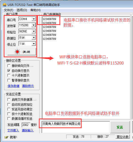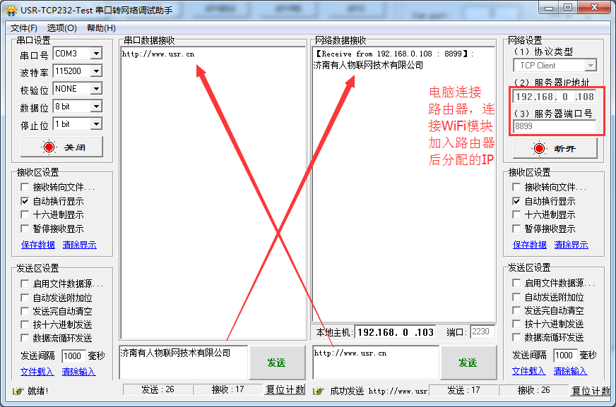 1:设置方式:以WiFi232-T为例,模块串口连接电脑串口,电脑连接WiFi。