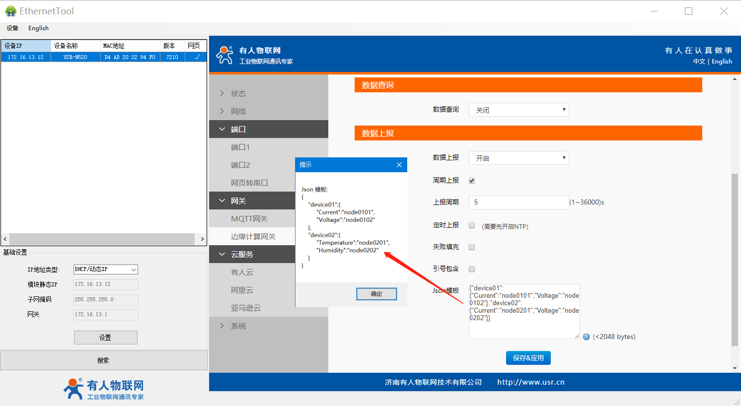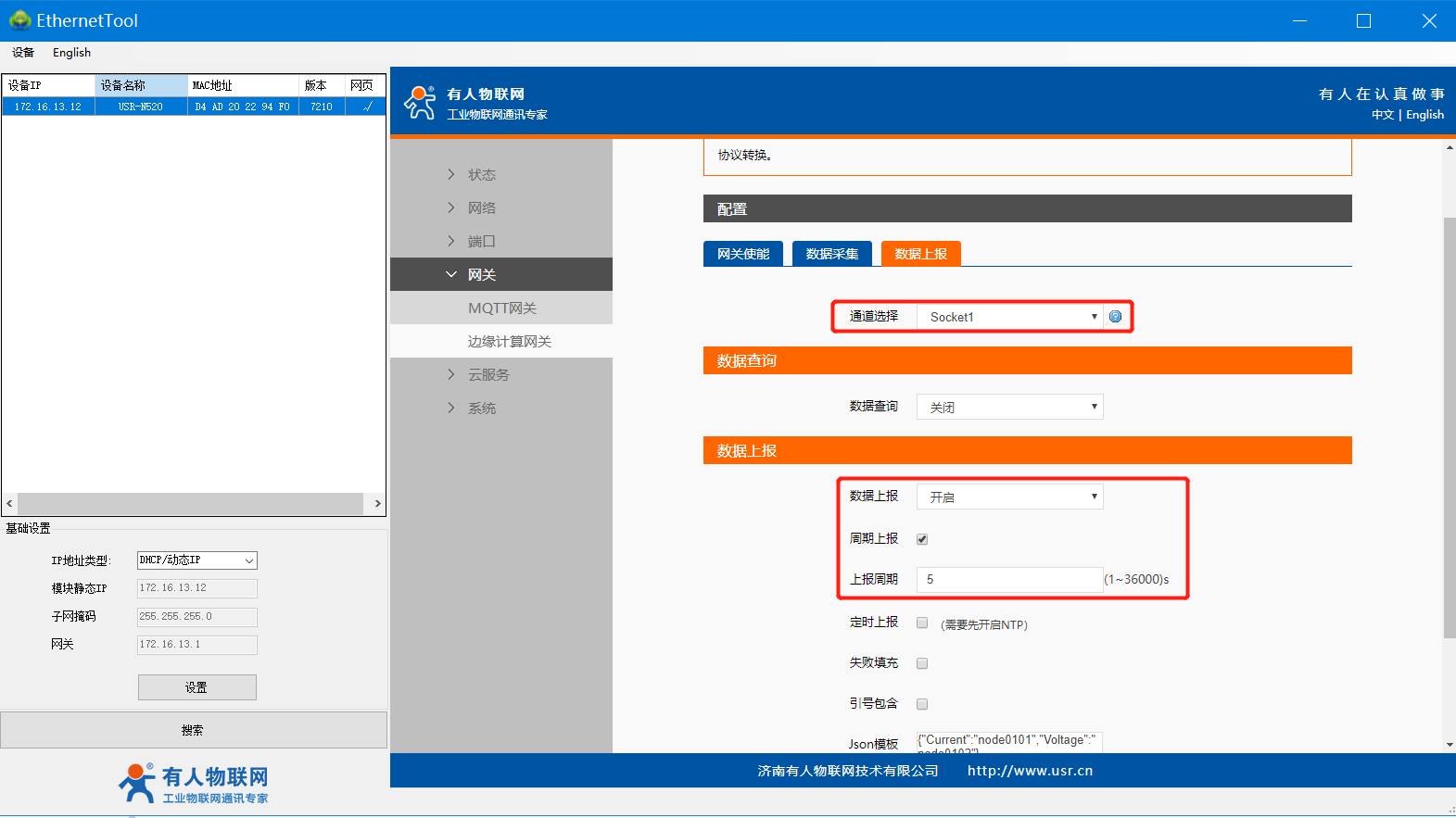 11>数据上报完成后,重启USR-N520,设备端设置完成
