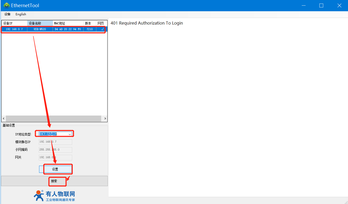 1>设置USR-N520的IP地址:打开设置软件--搜索--点击设备--选择DHCP/动态IP--点击设置