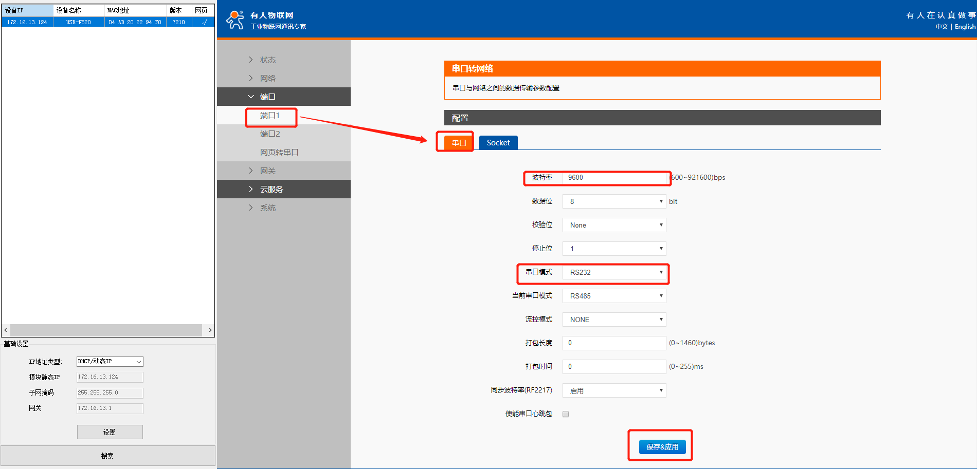 本案例中,波特率修改为9600,串口模式设置为RS232,只修改了这2个参数