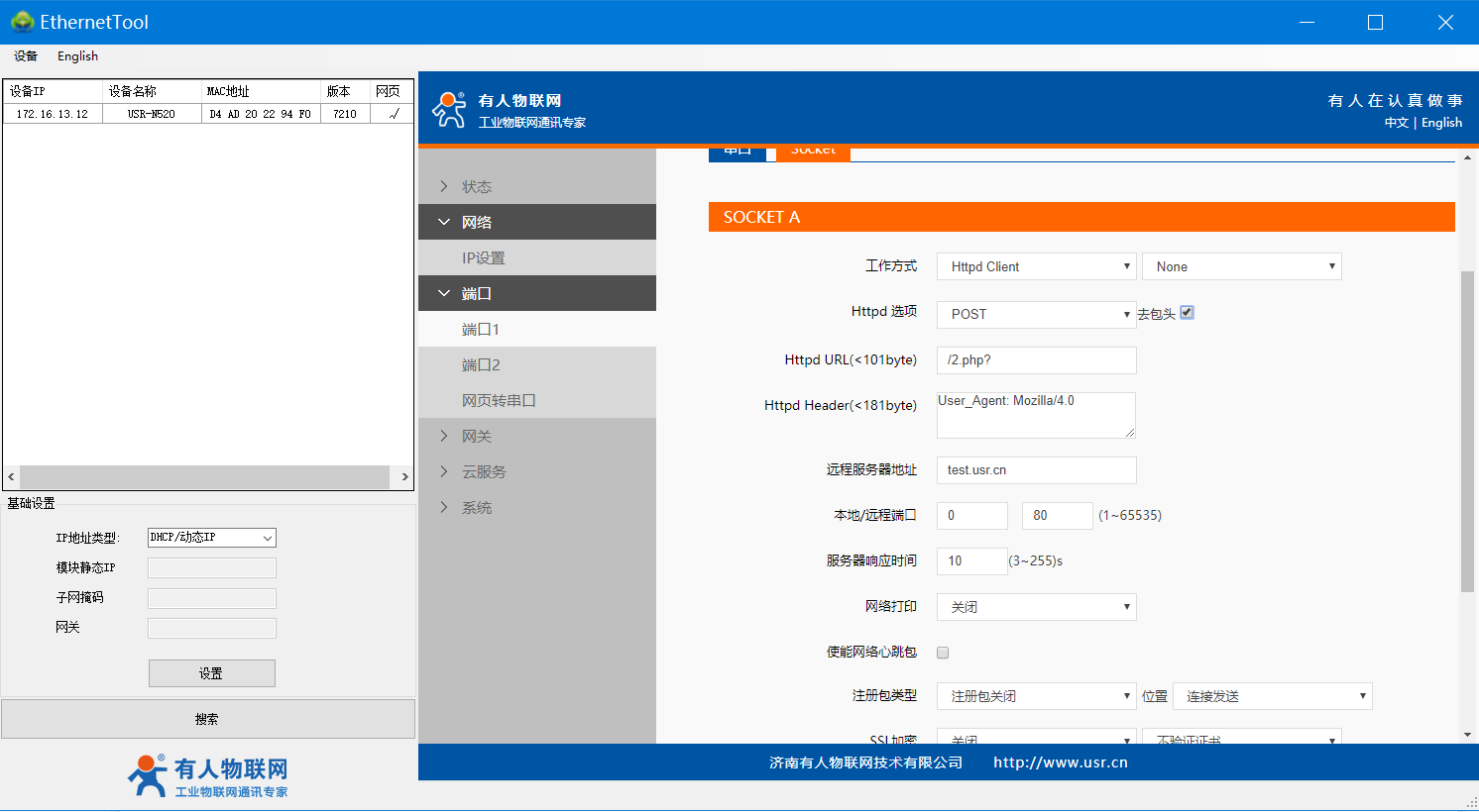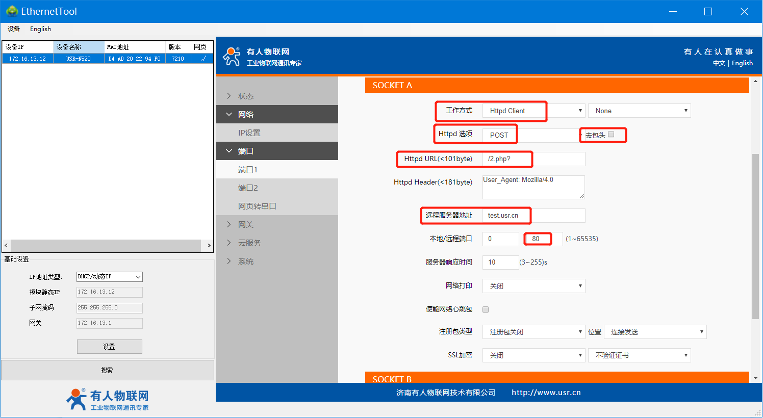 USR-N520-H7(二期)的HTTP POST使用案例