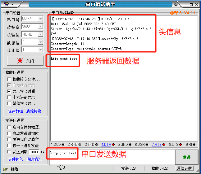 4. 数据测试:我司测试服务器的功能就是:串口发送数据给服务器,服务器将数据原封不动的返回