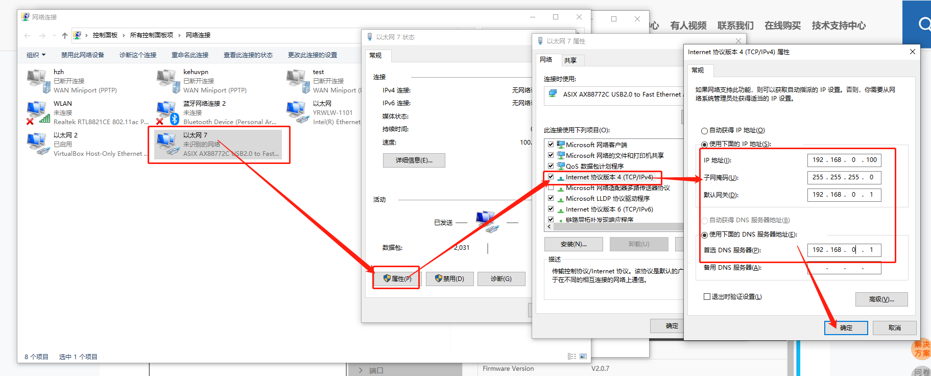 2)设备默认IP为192.168.0.7,需要将电脑网卡改为与设备一致,可在电脑更改网络适配器中更改
