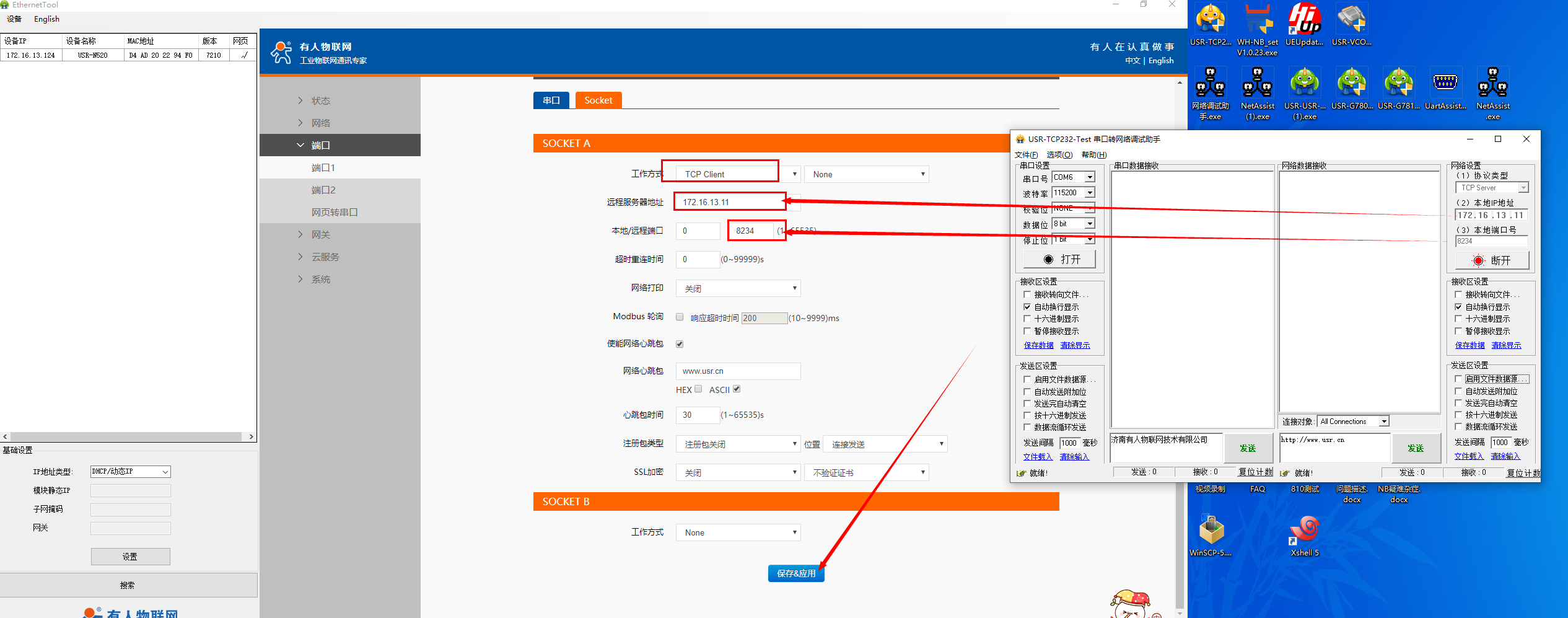 9)继续在软件中配置socket参数,工作方式选择tcp client,将服务器的IP以及端口填入到设备中,设置完成后点击保存并应用。全部参数设置完成后,点击重启。参数重启后生效