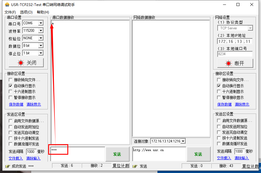 12)可以先判断一下串口是否通了,可以在串口发送+++,如果设备收到+++后会自动返回a,所以如果收到a就说明串口已经通了