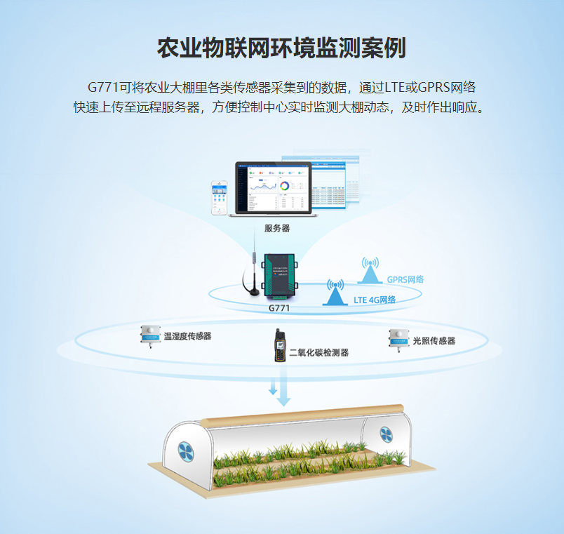 G771可将农业大棚里各类传感器采集到的数据,通过LTE或GPRS网络快速上传至远程服务器,方便控制中心实时监测大棚动态,及时作出相应