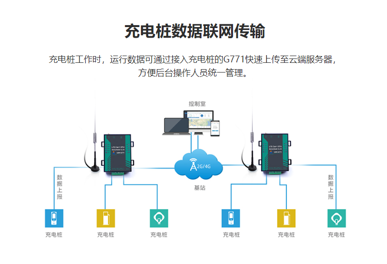 充电桩工作时,运行数据可通过接入充电桩的G771快速上传至云端服务器,方便后台操作人员统一管理