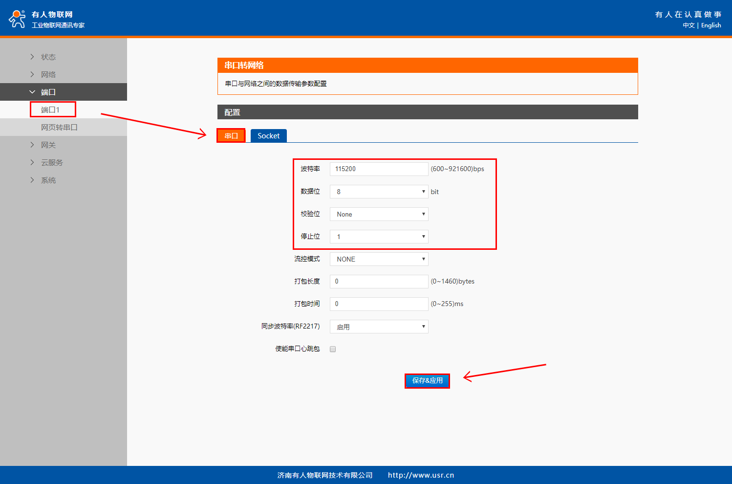 串口波特率/检验位/数据位/停止位修改与串口设备的串口参数一致,默认为115200波特率,无校验位(NOEN)数据位8,停止位1。