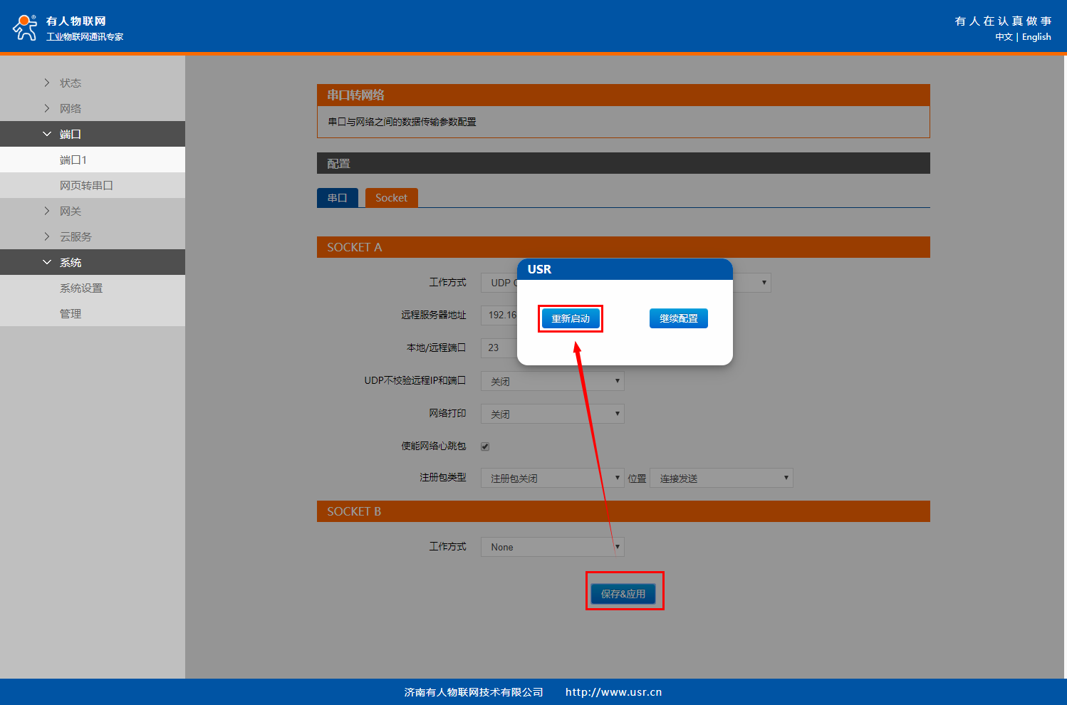 在“端口”>“端口1”界面中的“Socet”配置Socket A的工作模式为“UDP Client”
