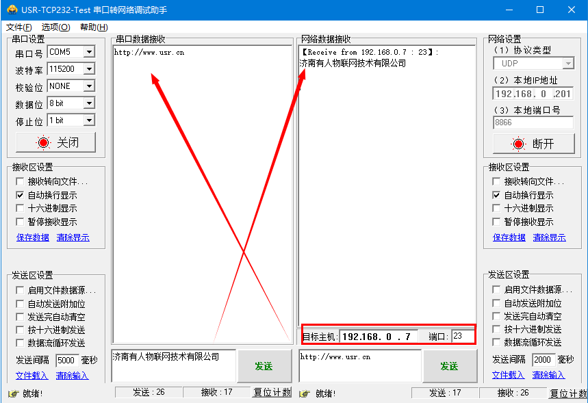 10、N510重启后,串口发送数据,网络端便可接收数据,网络对192.168.0.7,端口23发送数据,N510串口可透传输出。