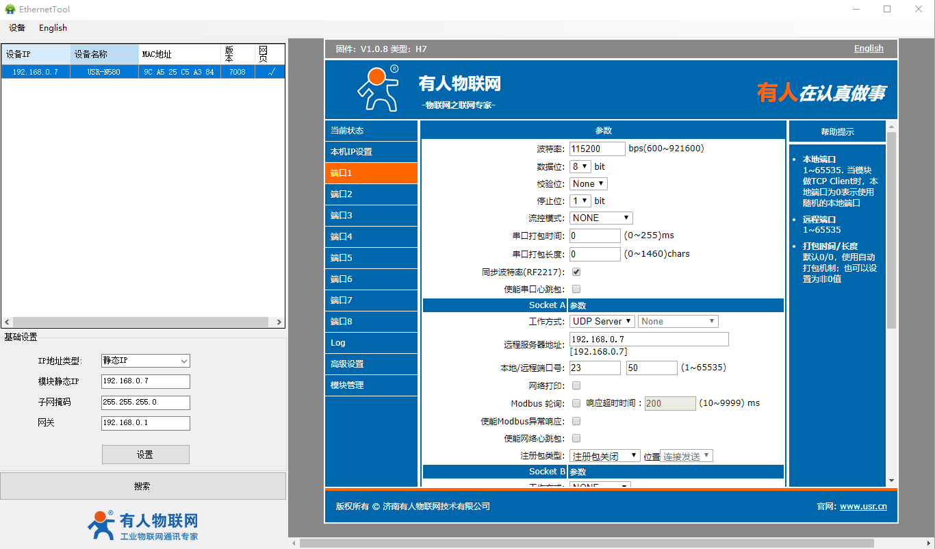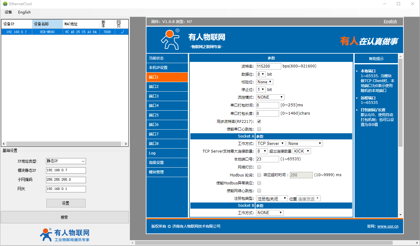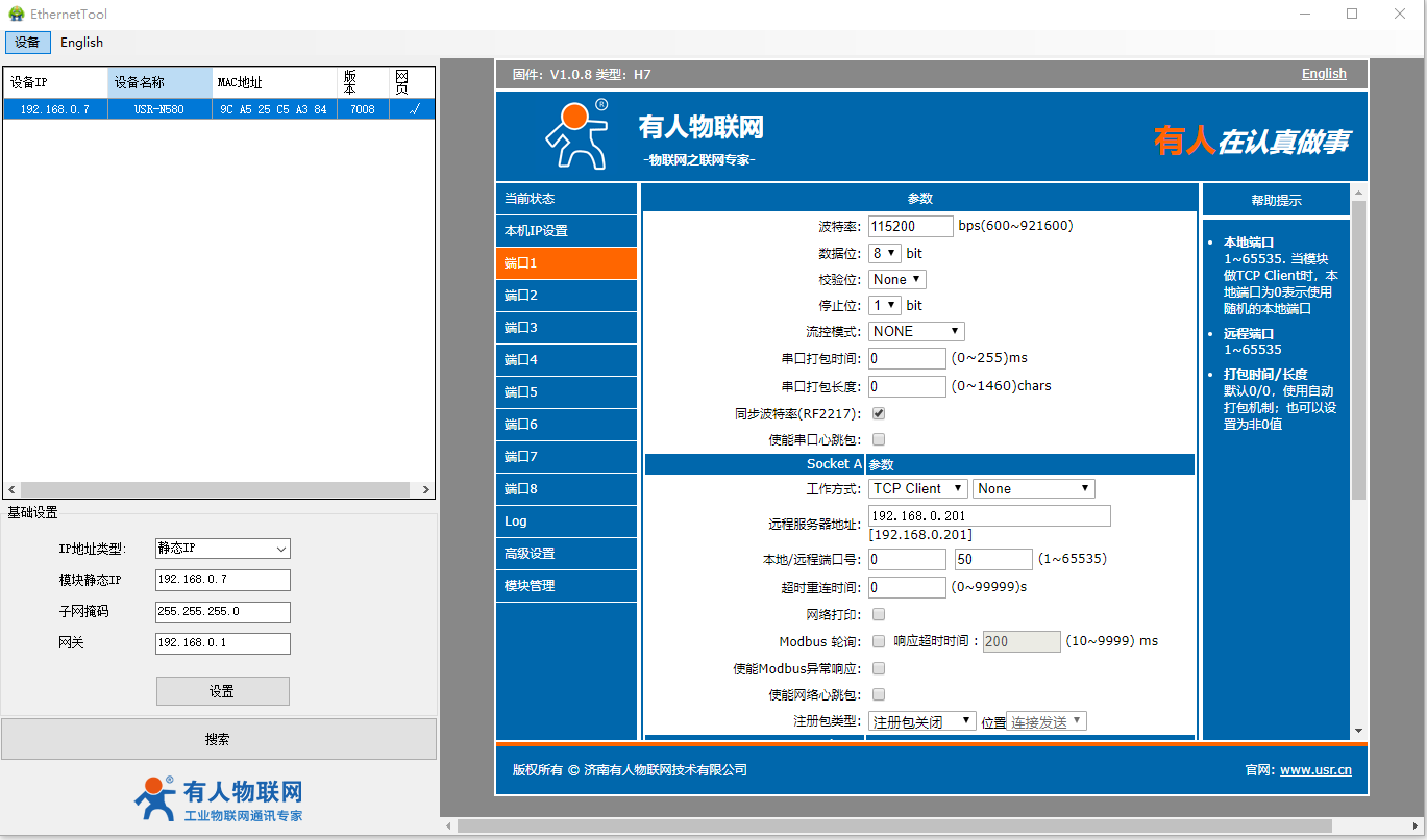 N580 RS485串口做TCP server,电脑下载的串口网络助手,左侧用COM口打开,串口参数和RS485串口参数保持一致,波特率、数据位、停止位、校验位。右侧用TCP client打开,服务器IP填N580的IP,服务器端口填N580的端口23。