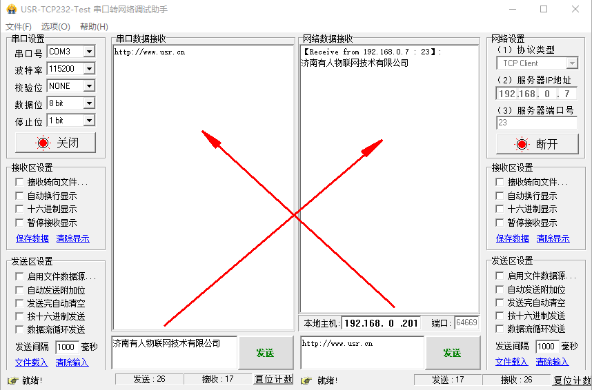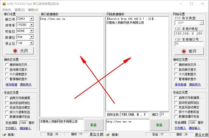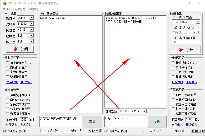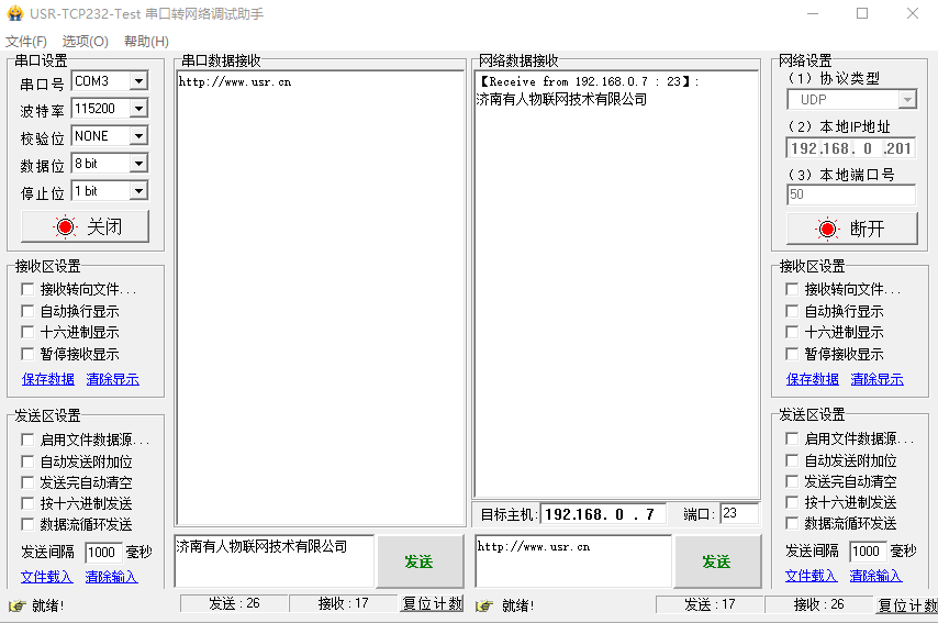 点击连接,有连接对象之后,测试串口和网络之间的数据传输。