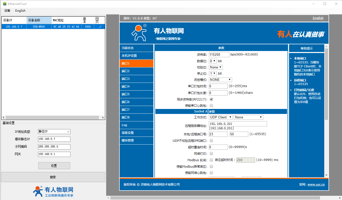 N580 RS485串口做UDP client,电脑下载的串口网络助手,左侧用COM口打开,串口参数和RS485串口参数保持一致,波特率、数据位、停止位、校验位。右侧用UDP打开,本地IP填电脑的IP,本地端口填电脑的端口50。目标主机填N580的IP,端口填23。