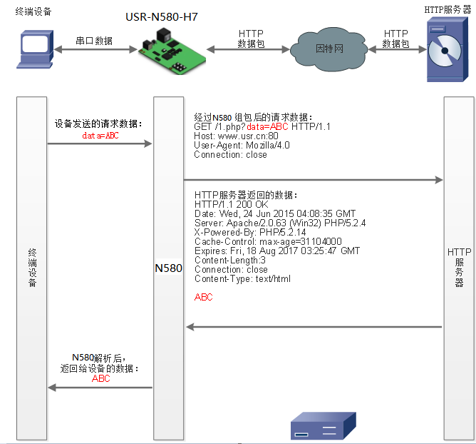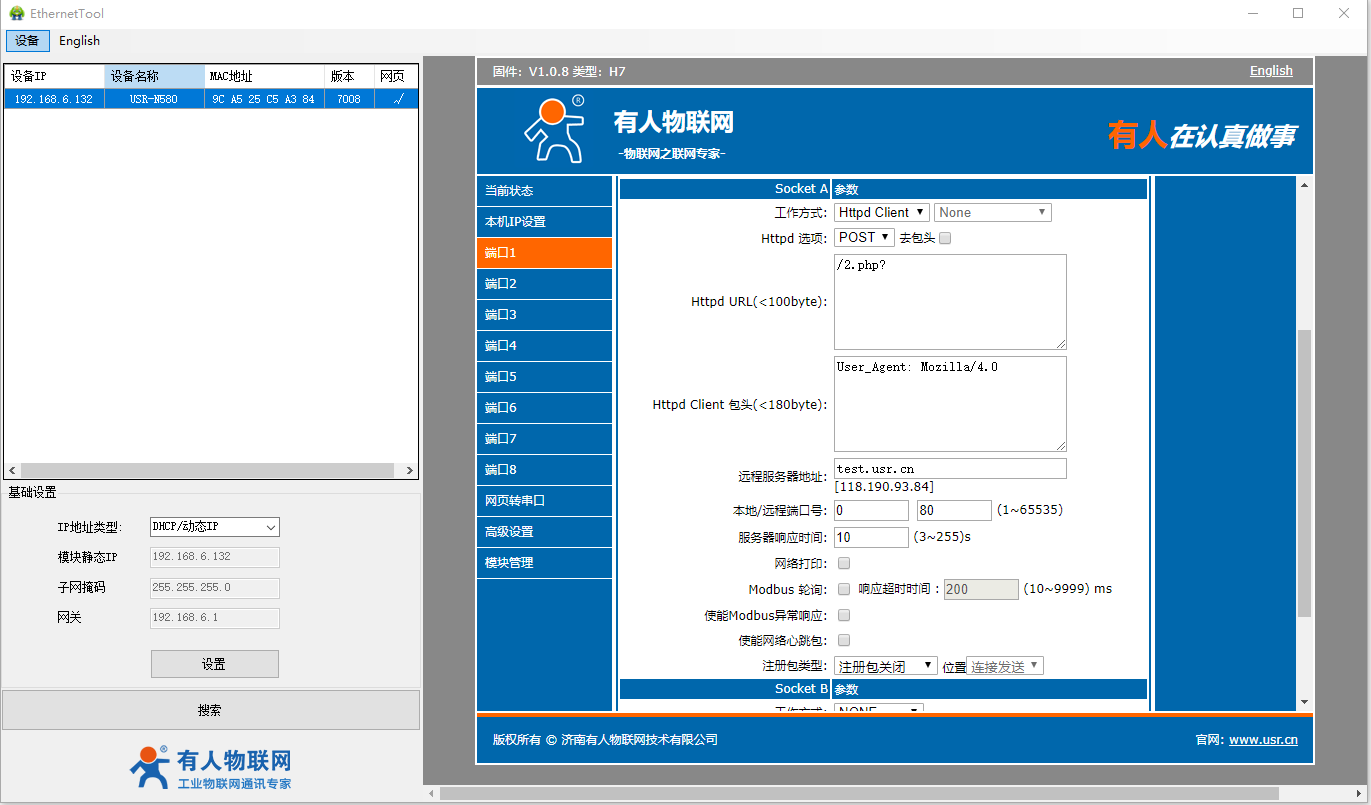 N580端口1工作方式设置HTTPD模式,POST,远程服务器地址填test.usr.cn,远程端口填80,本地端口号设置为0。URL填/2.php?,不滤除报头。