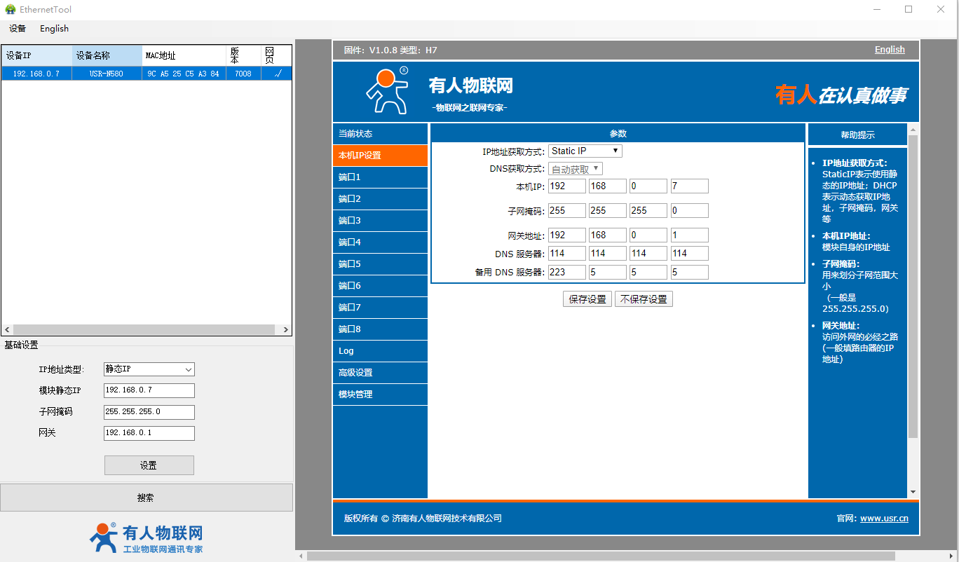 显示IP 192.168.0.7之后,鼠标单击产品信息,基础设置显示IP类型、IP、子网掩码、网关信息。