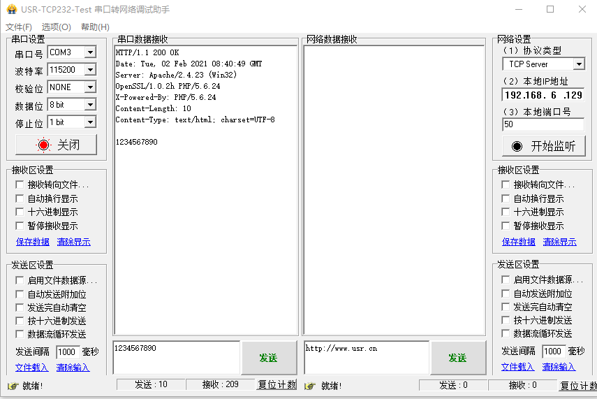 打开串口网络助手,串口参数和N580 端口1参数保持一致,串口发送数据1234567890,测试服务器返回数据。