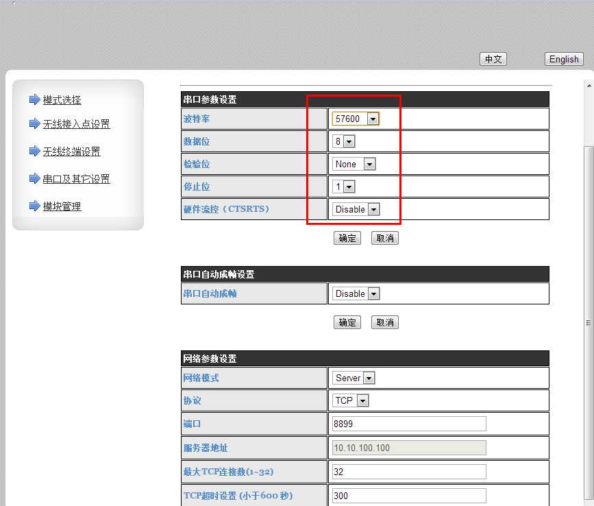 e. 进入串口及其它设置页面 ,修改波特率等同设备,同AP模块一致。修改完成后点击 确认 保存设置。