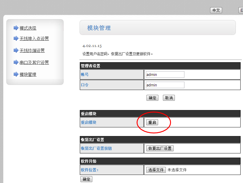 f.进入模块管理页面:点击重启。(AP模块必须READY灯亮后)