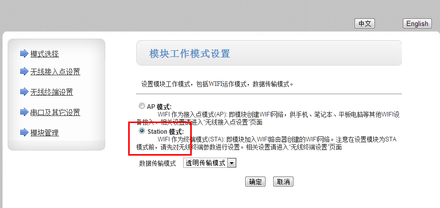 b.设为模块为STA模式,点击确定(不要马上重启模块,所有设定完成后再重启)