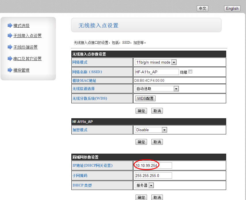 c.进入无线接入点设置,将模块的LANip改为10.10.99.254。点击确定保存。