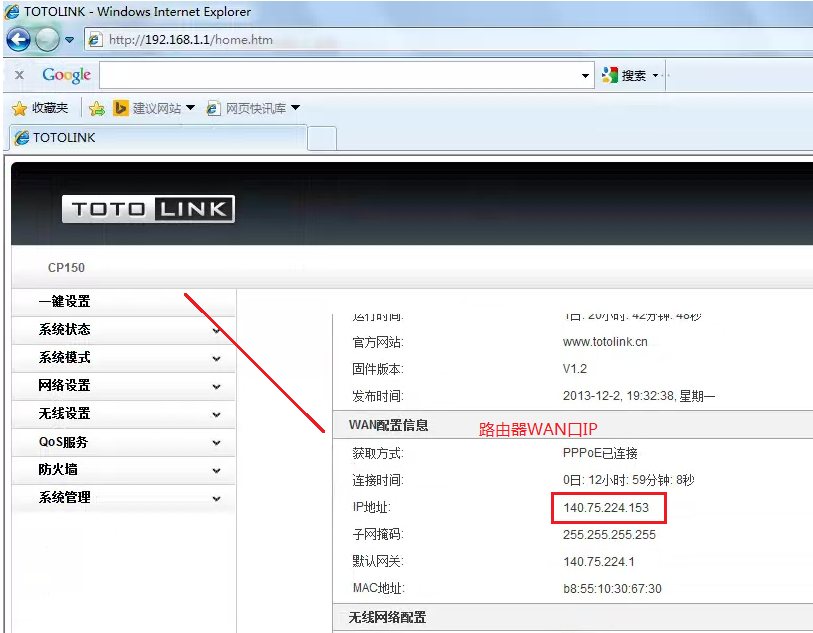 3:进去路由器网页查看路由器的WAN口IP是否为公网IP。将搜索到的IP与路由器WAN口地址进行比对,IP地址相同则可以实现此功能。