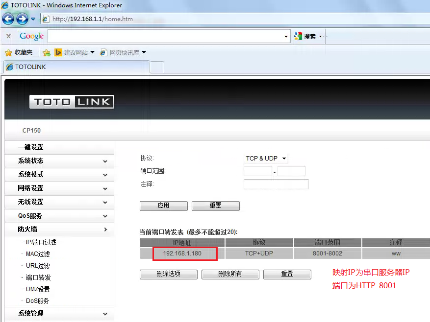 4:进入路由器进制端口转发端口映射,将串口服务器的IP地址和HTTP端口(8001)映射。
