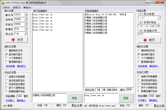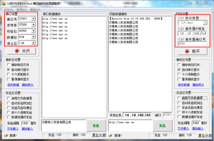 3.通信测试,串口向网络发送及网络向串口发送均可正常收到。