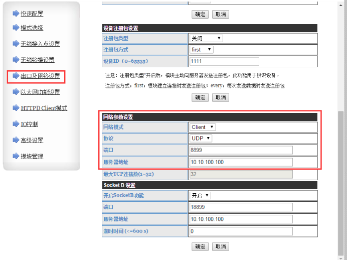 1.在串口及网络设置中设置网络模式为UDP Client,端口8899 。点击确定,重启模块。