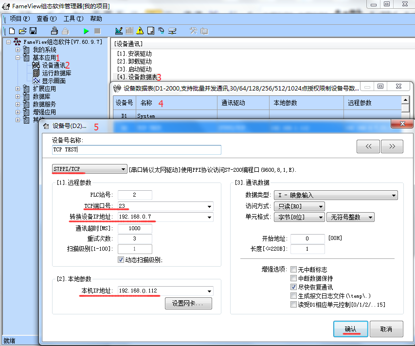 e)基本应用--设备通讯--启动驱动--S7PPI/TCP--确定