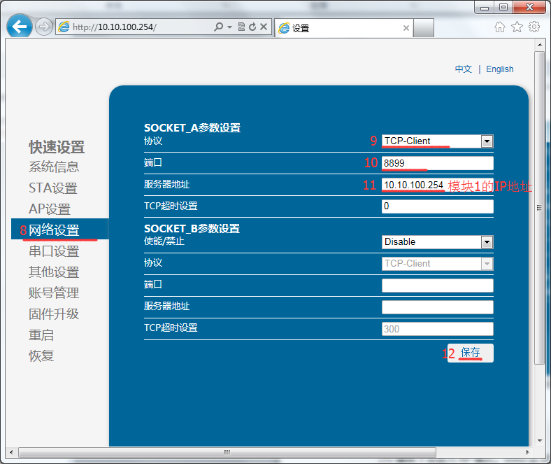 b.打开浏览器(推荐使用IE),输入10.10.100.254,账户密码admin,进入模块的网页, STA设置选项做如下设置。
