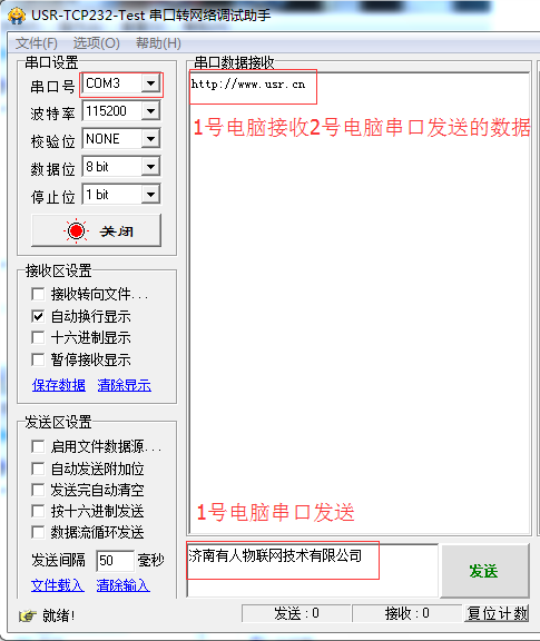 二、测试数据收发: 两台电脑分别有一个串口,1号电脑串口号为com3 ,1号电脑连接做AP模式WiFi模块的串口,2号电脑串口号为com5,2号电脑连接做STA模式WiFi模块的串口。
