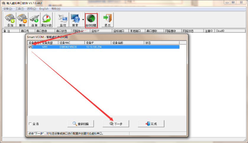 2:然后建立虚拟串口com1,点击自动创建,勾选搜索到的设备,点击下一步,提示创建成功,点击完成