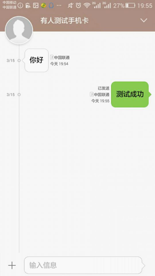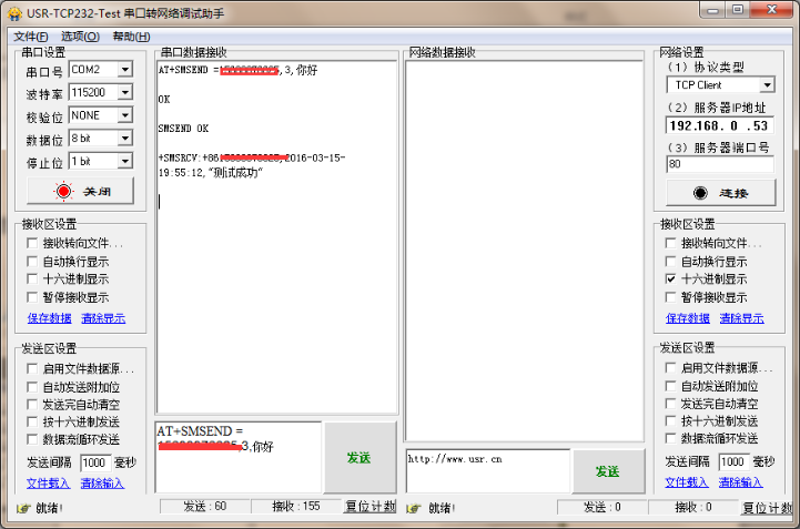 3、手机端接收GM3串口发送的数据:你好,手机短信发送:测试成功,在串口可以收到