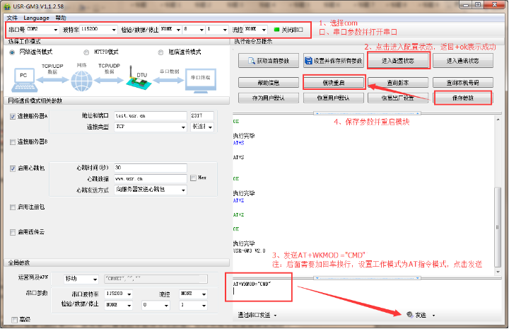 GM3在AT指令模式下支持标准的AT指令集,可以使用指令发送短信等,本文档通过两个例子说明使用AT指令发送短信: