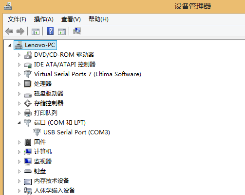 5.在设备管理器中查看端口信息,确定410S串口使用的串口号,如下图所示电脑端口号为COM3.