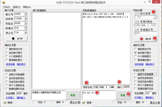 7、电脑连入相同无线路由器,打开串口转网络调试助手,设置网络端为UDP模式,连接后设置目标主机为4个255,为广播地址,广播端口为48899,发送广播指令www.usr.cn 返回模块获取到的IP(关于UDP广播端口和广播指令在附加功能内可以查询及设置)。