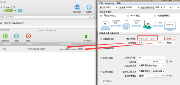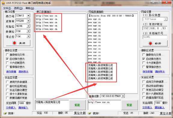 8.使用有人Test调试助手软件测试GPRS DTU串口到网络数据收发情况。