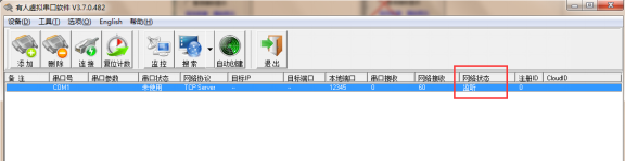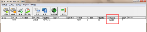 如使用一个GPRS DTU建立连接时会在网络状态上显示已连接(1)。网络状态如果一直显示监听状态,请检查之前设置参数是否有误,
