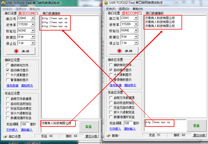 10.使用Test调试助手软件测试GM3串口到虚拟COM口数据收发情况。