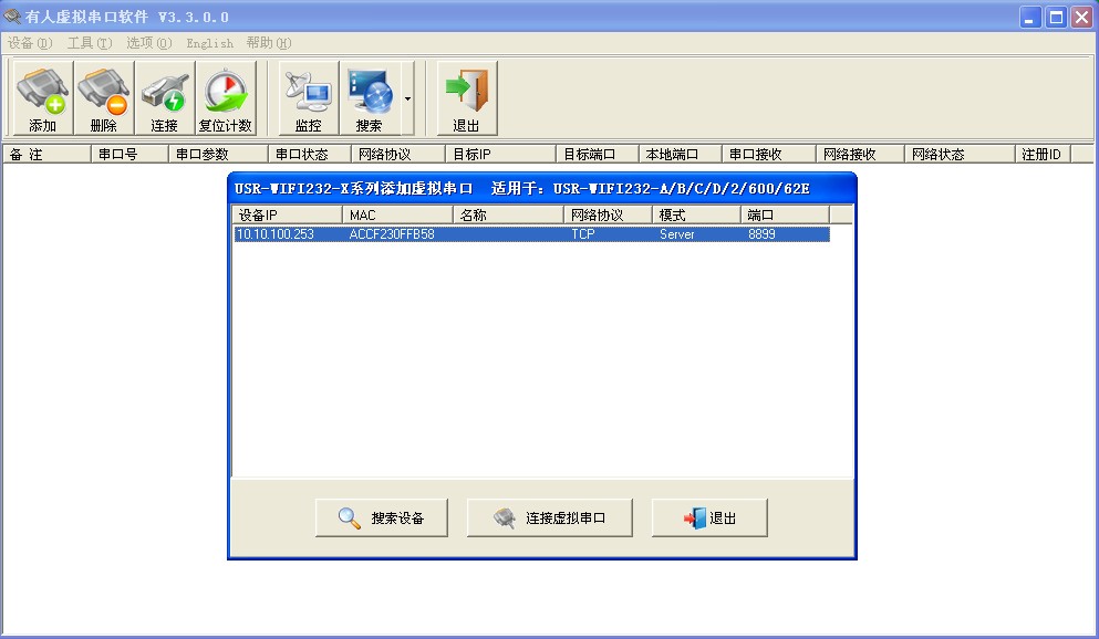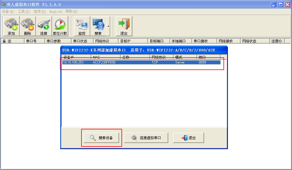 打开有人虚拟串口软件USR-VCOM,点击搜索,选择“USR-WIFI232-XX”系列产品