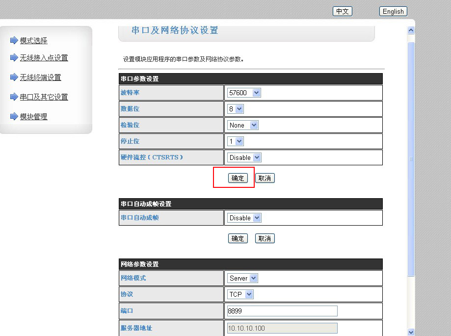 1. 串口自动成帧设置和网络参数设置无特殊要求用默认的参数即可。