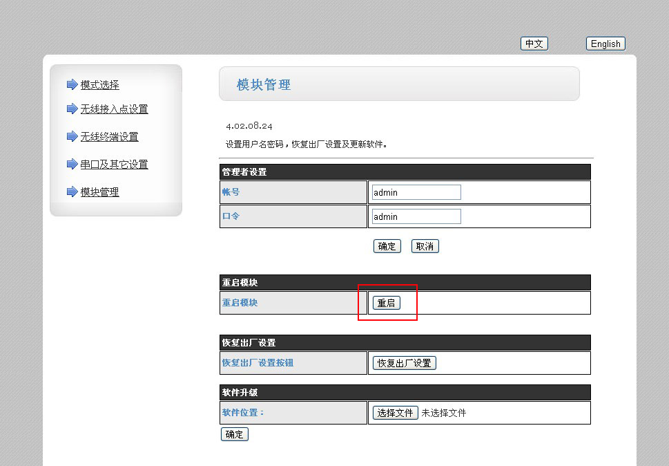 进入“模块管理”界面,点击“重启”,使设置生效。