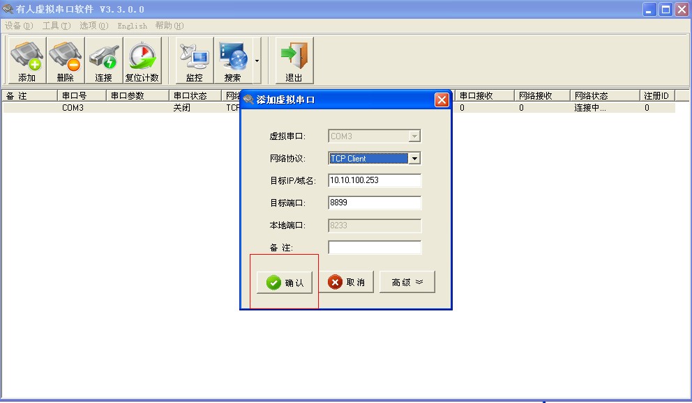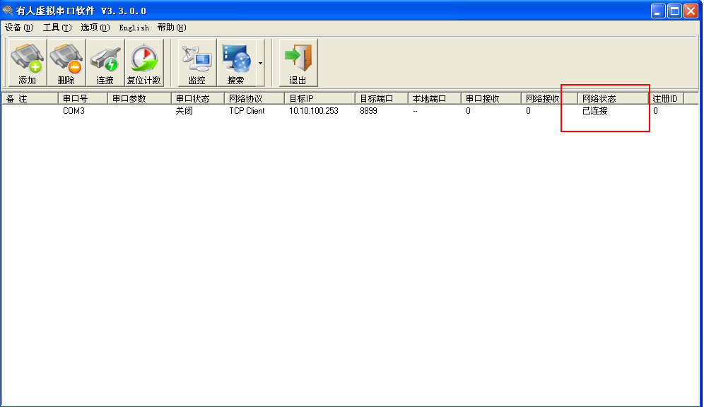 6.此时虚拟串口建立完毕,查看网络状态为已连接,则证明网络通信已成功。如果网络状态为监听或连接失败,择注意计算机上是否有双网卡,禁用掉不用的网卡。查看是否开启了WINDOWS防火墙,关闭防火墙。