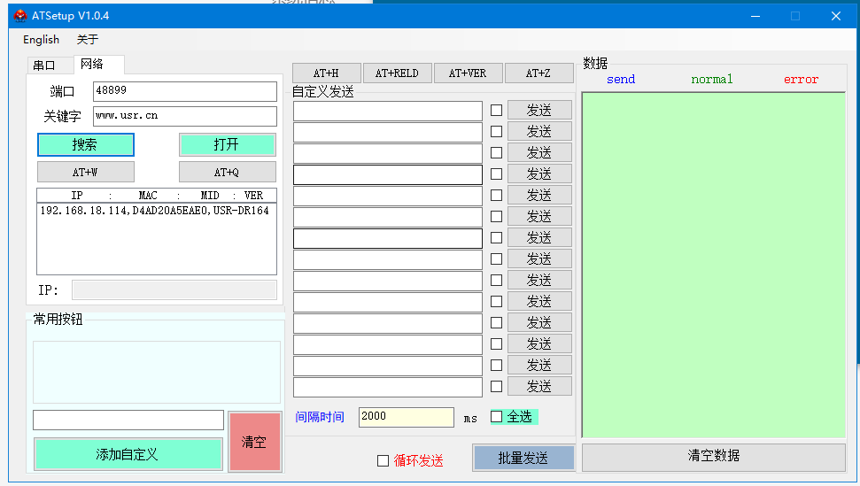 电脑下载打开USR-DR164的串口AT指令设置软件ATSetup,点击网络,用关键字www.usr.cn和端口48899,搜索连接路由器之后,从路由器获取的IP: