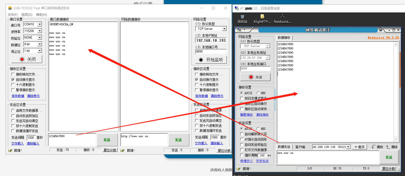 远程网络发送数据www.usr.cn,串口接收www.usr.cn。