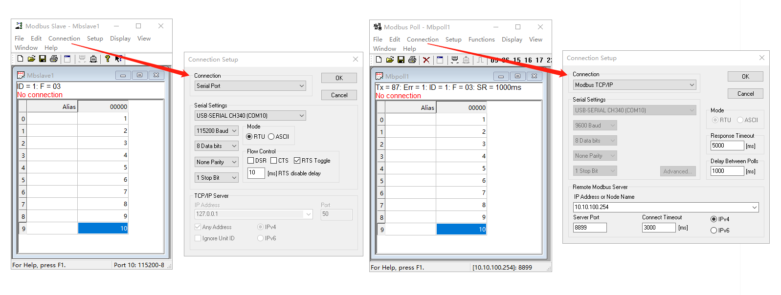 2、打开MODBUS SLAVE和MODBUS POLL软件,MODBUS SLAVE的Connection选择串口COM10,串口参数设置和DR164一致。MODBUS POLL的Connection选择Modbus TCP/IP,IP地址填10.10.100.254,端口填8899。