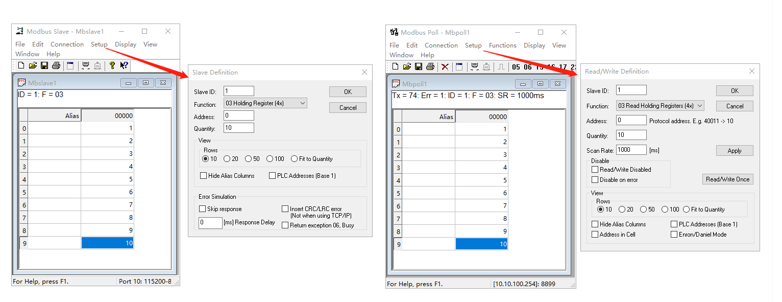 1、打开MODBUS SLAVE和MODBUS POLL软件,Setup设置一样,Slave ID 用1,Function 03功能码,Address寄存器起始地址0,Quantity寄存器数量10。