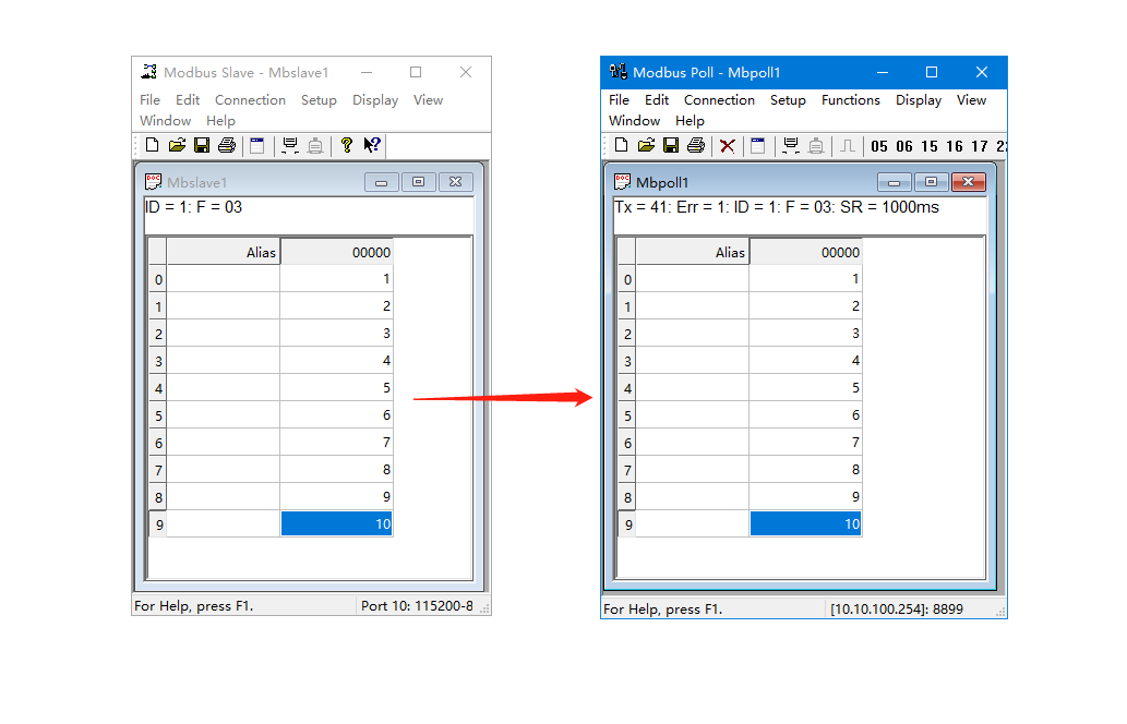 MODBUS SLAVE软件改变数据,对应MODBUS POLL软件采集到数据。