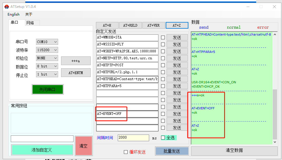 打开ATSetup 软件,选择COM口号COM10 ,波特率115200,打开串口,点击+++a,依次发送以下AT指令: