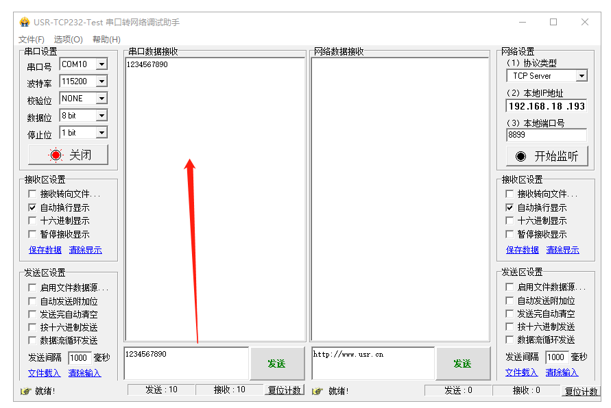 (3)在电脑上用USR-TCP232-TEST软件测试,打开对应的COM口,测试串口发送数据1234567890到我们测试服务器,测试服务器返回数据数据1234567890。